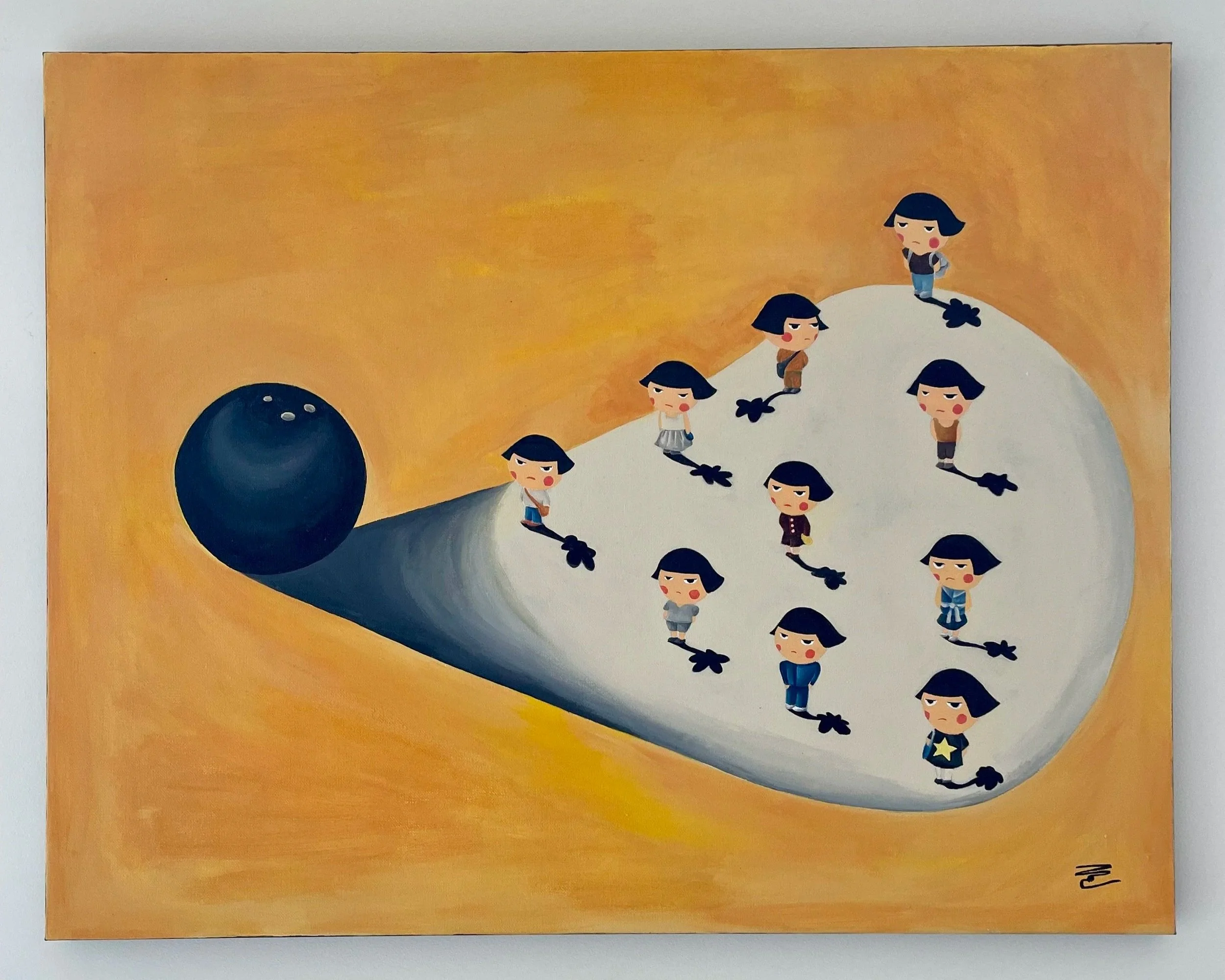 "I have felt that life has ways of knocking me down when I least expect it but later, it helps me discover a new path. So, for my idea I was inspired by my own successes and failures to get to where I am today. I wanted to create a fun way to describe this, so I turned ryun into bowling pins. On the right is a bowling ball that represents “life” and to the left are ten ryuns that are pins to be knocked down."